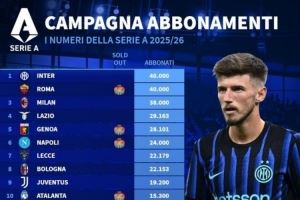 体育资讯9月25日讯 2025-26赛季意甲各队季票销售数量榜出炉,其中国米、罗马4万张并列第一。